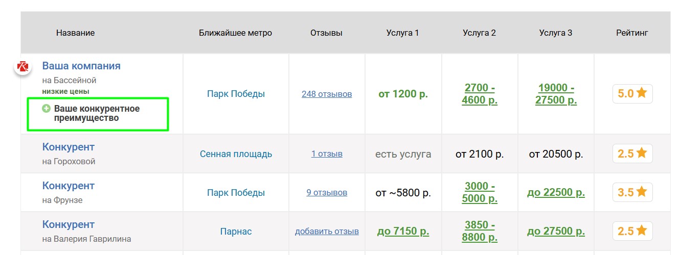 Если компания имеет конкурентные преимущества, мы можем их опубликовать на странице студии и показывать в таблицах в соответствующих страницах. Преимущества можно гибко настраивать для разных услуг. Правильная публикация преимуществ существенно увеличивает интерес клиентов, так как выделяет студию в таблицах и показывает, почему следует обратиться именно туда.